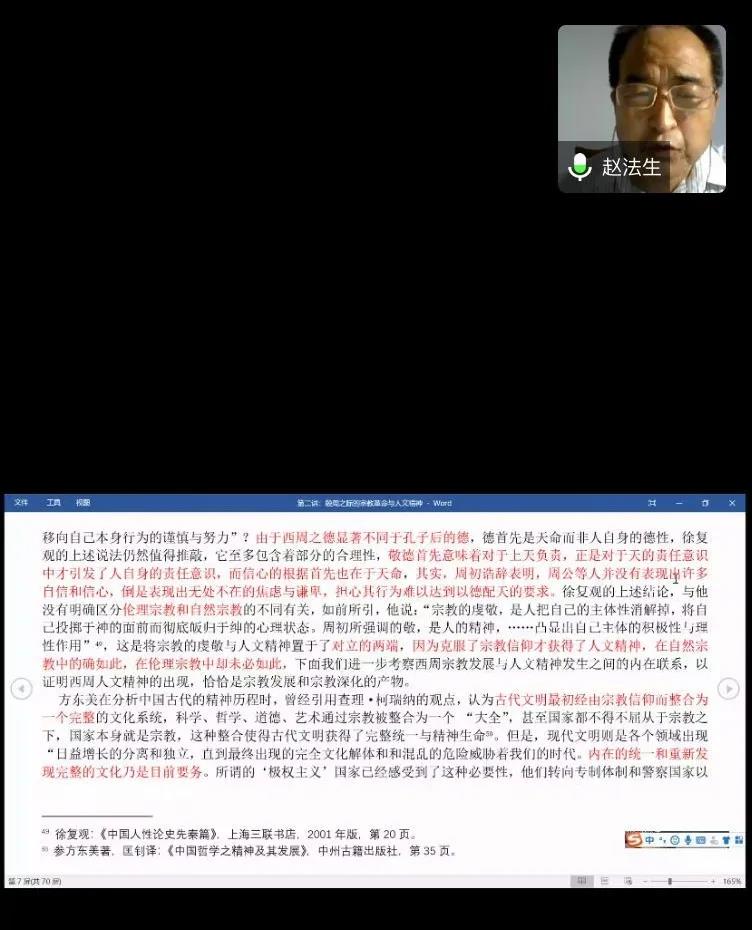 2020年7月2日晚,“西北哲学讲坛”第18讲在腾讯会议线上平台顺利开讲。中国社会科学院世界宗教研究所赵法生研究员为学院师生及其他在场听众讲授《殷周之际的宗教革命与人文精神》。本次报告由院长张学广教授主持,王雪梅教授担任评论。